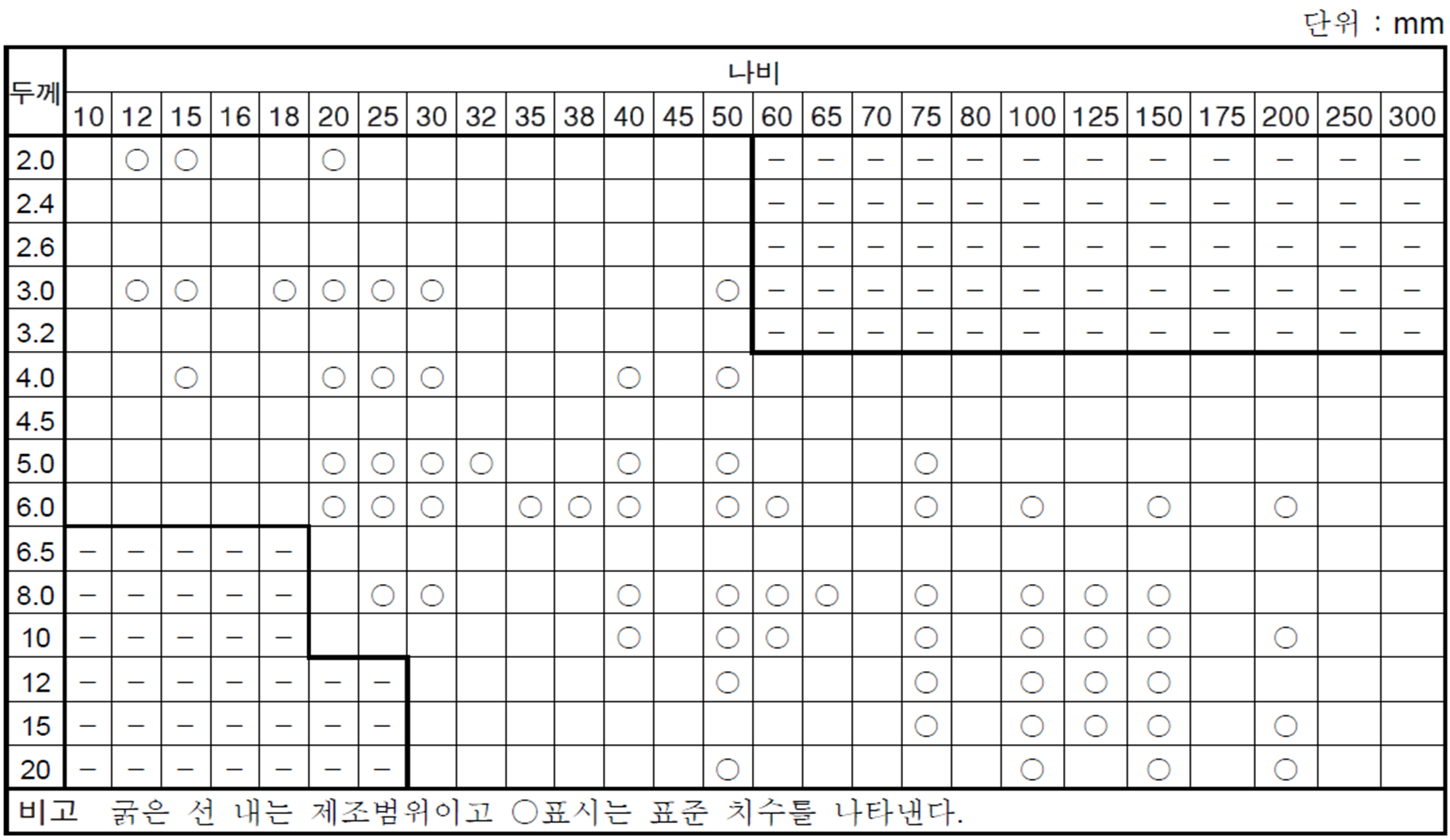 : Min. 3x12mm ~ Max. 20x200mm - 기타 규격(두께 / 나비)은 담당자와 협의하여 결정한다.